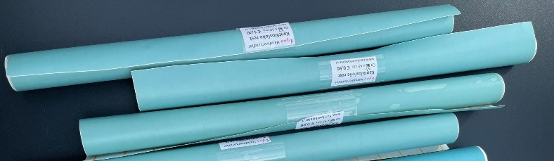 Enkelzijdige plakfolie, mat licht blauw, voor beschermen van het prikking waar de spelden opgeprikt worden tijdens het klossen.
